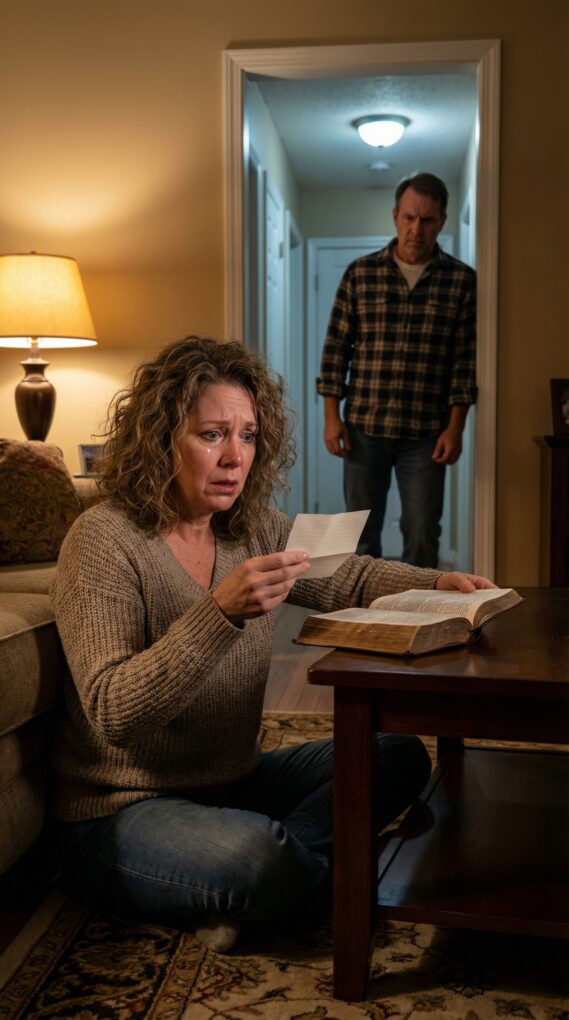 My name is Rebecca Lawson, and the day I opened my husband’s Bible was the day my marriage shattered. I wasn’t snooping. I was cleaning the living room when his worn leather Bible slipped from the coffee table and hit the floor. A folded piece of paper slid out. I almost ignored it, thinking it was a sermon note. But something about the way it was tucked deep inside made me pause. I picked it up and unfolded it. Four words froze the air in my lungs: “If she finds out, end her.” My hands started shaking so badly I had to sit down. End her? End who? Me? The handwriting was unmistakably my husband Daniel’s. I had seen it on grocery lists, birthday cards, years of normal life. I read the sentence again and again, hoping it would rearrange itself into something harmless. It didn’t. My heart pounded so hard I could hear it in my ears. Daniel was a respected church elder, a calm, measured man everyone trusted. He led prayer groups. He counseled couples. He kissed my forehead every morning before work. I whispered out loud, “What is this, Daniel?” The house felt suddenly unfamiliar. I looked around at the framed family photos on the wall—our two grown sons, our vacations, our anniversaries. Had any of it been real? I didn’t call him. I didn’t confront him. Instead, I carefully folded the note and slipped it back into my pocket. That night, Daniel came home as usual, smiling. “You look pale,” he said gently. “Are you feeling okay?” I forced a nod. “Just tired.” He reached for my hand, and for the first time in twenty-seven years, I flinched. His eyes narrowed slightly. “Becky?” I swallowed. “Daniel… is there something I should know?” His expression hardened for a split second—so fast most people would miss it. “About what?” he asked calmly. I studied his face, searching for guilt, fear, anything. But he only smiled again, too perfectly. I went to bed that night pretending to sleep, listening to his breathing beside me, wondering if the man lying inches away had ever truly been the man I married. And just before midnight, my phone buzzed with a notification from an unknown number: “He doesn’t know you found it yet.”