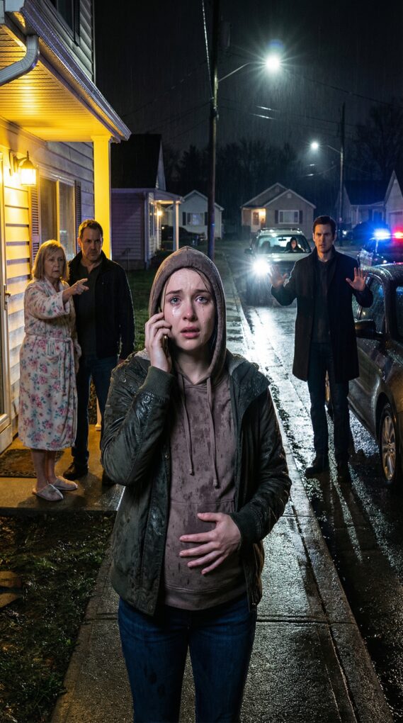 I looked back at the house—at the porch light, at the curtains that hid the people who’d raised me and just threw me away. “Outside,” I said. “In the rain.”