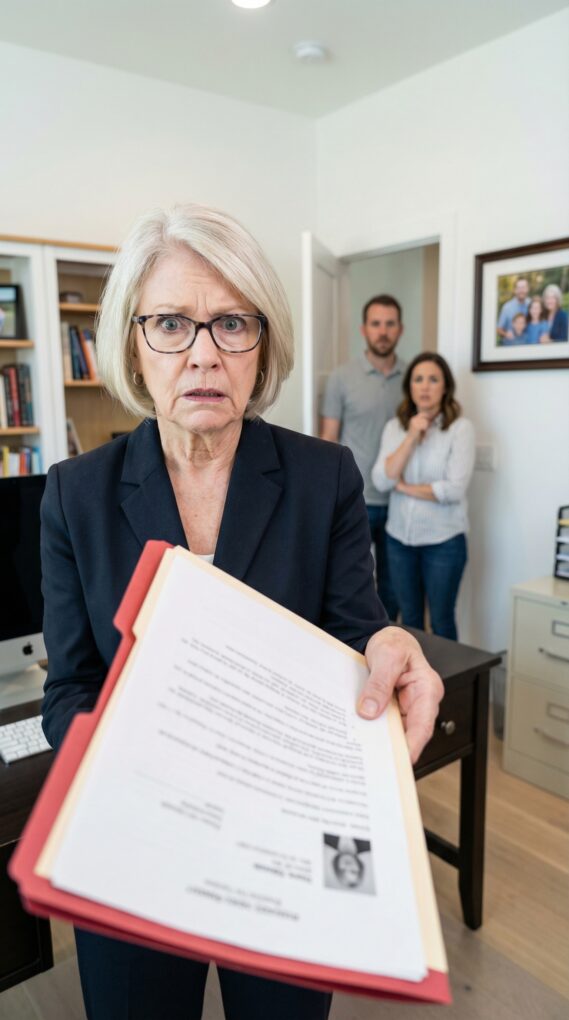 Kevin walked in cheerful, suitcase in hand. “Mom! Trip got cut short,” he said. Rachel followed behind, her smile tight. I stood in the living room, calm on the outside, storming inside. “How was Arizona?” I asked evenly. Kevin blinked, surprised by my tone. “Fine… why?” I gestured toward the hallway. “We need to talk in your office.” Rachel’s face flickered with alarm. Kevin hesitated but followed. The red folder was exactly where I’d left it, like a silent witness. I picked it up and placed it on the desk between us. “Explain,” I said. Kevin’s face drained of color. Rachel crossed her arms. “You went through our files?” she snapped. I ignored her. “Kevin. Guardianship. Assisted living. My finances. My medical decisions. Explain.” Kevin stammered, “Mom, it’s not what you think.” I laughed bitterly. “Then what is it? A surprise birthday card?” Rachel sighed dramatically. “We were trying to plan ahead. You’re seventy-two. Things happen.” My voice sharpened. “I am not incompetent.” Kevin rubbed his temples. “Mom, Rachel worries. She thinks you shouldn’t be alone.” “So your solution is to take my autonomy?” I asked. Rachel’s eyes hardened. “We have kids. We can’t drop everything if you fall.” That was the truth beneath it: inconvenience. Kevin’s shoulders slumped. “We just wanted to be prepared.” I leaned forward. “Prepared for what? For controlling my money? Selling my house?” Rachel snapped, “Don’t be paranoid.” I opened the folder again and slid out the section listing my assets—my home, my savings, my retirement account. Kevin’s silence was louder than any confession. I stood slowly. “You didn’t tell me. You didn’t ask. You decided.” Kevin’s voice cracked. “I thought it was for the best.” I shook my head. “The best for who?” Rachel scoffed. “This is ridiculous. You’re acting like we’re villains.” I met her gaze coldly. “If you have to hide paperwork to do it, you already know it’s wrong.” That night, I called my attorney before I called anyone else. By morning, the first thing I did was protect myself.