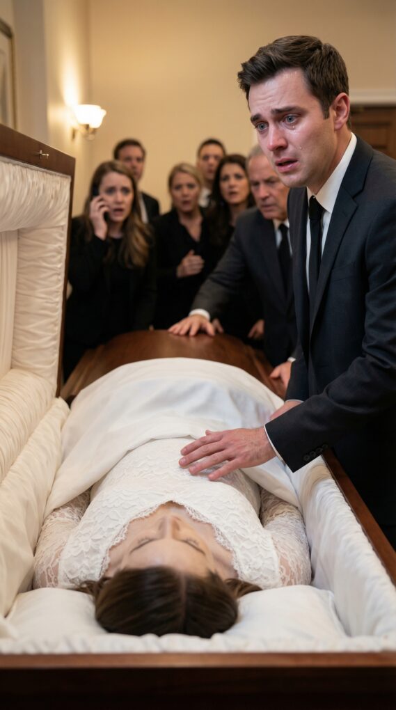 A paramedic team arrived within minutes, and suddenly the funeral home smelled like antiseptic and urgency. One of them snapped open a kit and set electrodes on Claire’s chest. The monitor chirped, then paused, then chirped again.