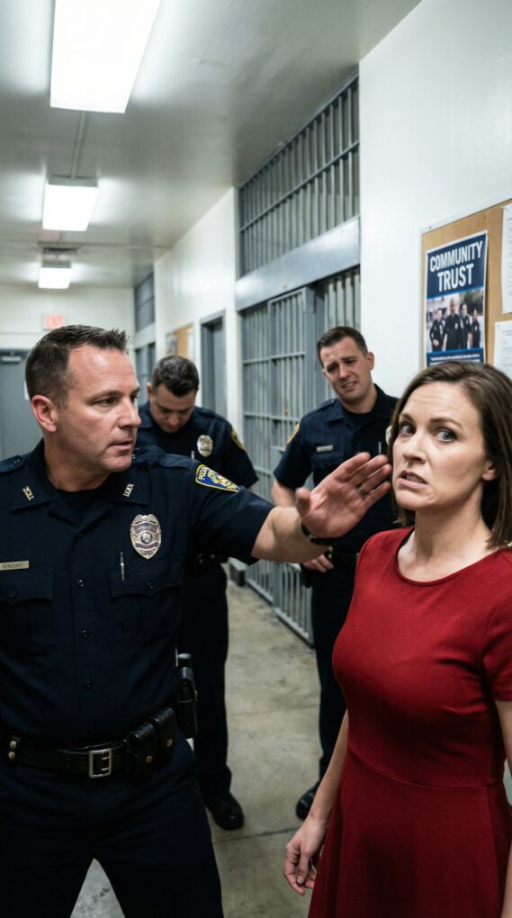 He signaled to an officer outside—young, nervous, eyes darting away from Sarah’s face. The officer hesitated for half a second, then followed orders. Sarah’s cuffs tightened as she was marched past the front desk, past a bulletin board about “community trust,” and into the holding area.