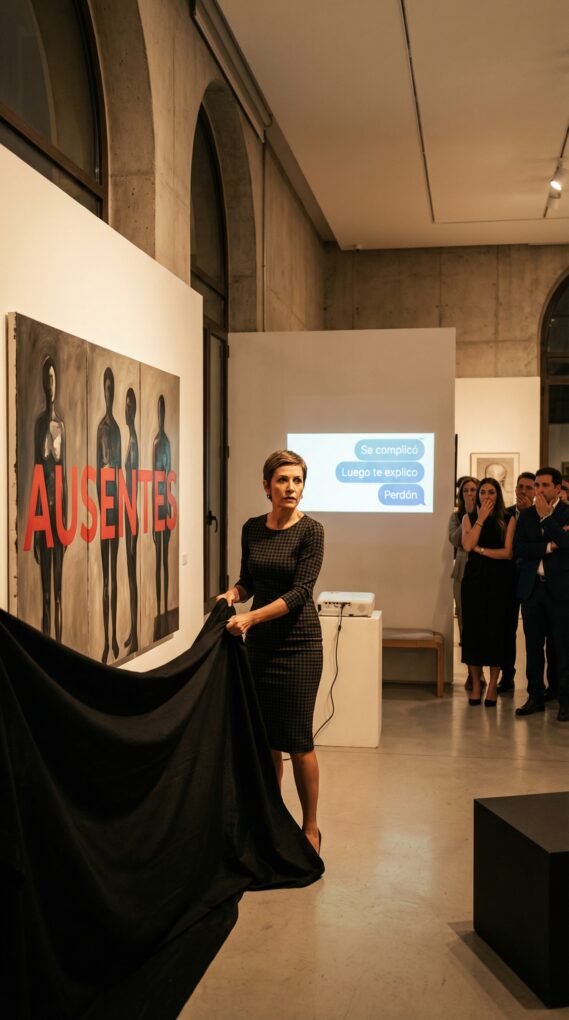 Tiré de la tela negra y “Ausentes” apareció como una bofetada: un tríptico con tres retratos a tamaño real, pintados con una precisión que dolía. No era solo su cara; era su gesto de “tengo prisa”, su mirada de “esto no me toca”, sus manos sosteniendo un móvil iluminado. Debajo de cada retrato, en letras pequeñas, copié sus frases exactas de los últimos años: “No puedo, estoy liado”, “Luego paso”, “Otro día”. El público murmuró. Una señora mayor se llevó la mano al pecho. El periodista levantó la cámara sin pedirme permiso; yo tampoco se lo pedí. “Antes de que alguien piense que esto es venganza”, dije, “quiero que sepan que es memoria. Y la memoria, cuando se ignora, se pudre.” Me temblaban las rodillas, pero seguí. Expliqué que esa noche inauguraba sola porque así había sido casi todo: cumpleaños organizados por mí, mudanzas cargadas por mí, silencios tragados por mí. Y entonces solté lo que me había decidido en el baño, cinco minutos antes, mirándome al espejo: no iba a rogar más. “Esta pieza se subastará hoy mismo. Y el dinero irá a una asociación de mujeres que salen de relaciones de dependencia. A mi nombre… y al de mis tres hijos, porque también es su responsabilidad aprender lo que cuesta estar.” Alguien aplaudió. Después, más manos se unieron. La sala se calentó. El periodista sonrió como si oliera un titular perfecto. La subasta empezó improvisada, con una tablilla y un rotulador. “¿Mil euros?”, dijo un hombre. “Mil doscientos”, respondió una chica joven. Sentí vértigo: yo había puesto 300 como precio, por pudor. En menos de diez minutos ya iban por 2.500. Cada puja era un golpe de realidad: mi trabajo valía, aunque mi familia no estuviera. Al terminar, mi móvil vibró como una avispa atrapada. Dani llamó primero. “¡Mamá, ¿qué estás haciendo?! ¡Quita eso ya!” Marcos entró en línea: “¿Estás loca? ¡Isabel lo ha visto, todo el mundo lo está compartiendo!” Lucía, por fin, escribió: “¿Por qué nos humillas?”. Me fui al patio para respirar. “No os he humillado”, contesté con la voz baja, “os he retratado.” Marcos insistió: “Eso es privado. Estás manchando nuestro apellido”. Y entonces dije la frase que les cortó el aire: “Mañana voy al notario. El estudio de tu padre, y el fondo que dejó para vosotros, dejarán de ser un premio automático. Quien quiera seguir siendo beneficiario tendrá que presentarse, mirar a los ojos y explicar por qué una exposición no merecía ni una hora.” Hubo un silencio pesado. Luego Dani susurró: “¿De verdad lo vas a hacer?”. “De verdad”, respondí. “Y si venís ahora, llegáis a tiempo de ver el último martillazo de la subasta.”