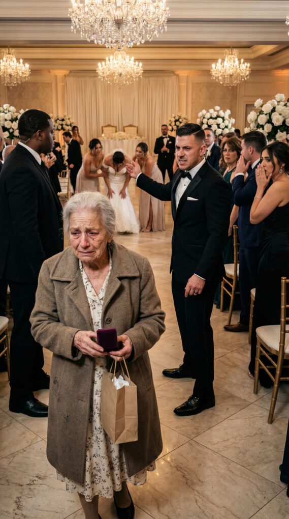 The ballroom looked like a magazine cover—white roses, crystal chandeliers, tuxedos that probably cost more than my rent. I clutched a small gift bag to my chest, the paper crinkling with every nervous breath. Inside was a velvet box with my late husband’s wedding ring, polished until it shone again. Evan had asked for it years ago, then forgot. I wanted to place it in his hand myself, like a blessing.