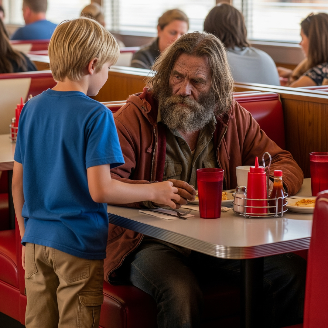 I felt my chest tighten. We didn’t know him. What if Liam bothered him? What if he got scared or worse—what if the man got angry? I started to stand, but before I could reach them, Liam stopped at the edge of the booth. He stood there, small and bright against the dull diner light.