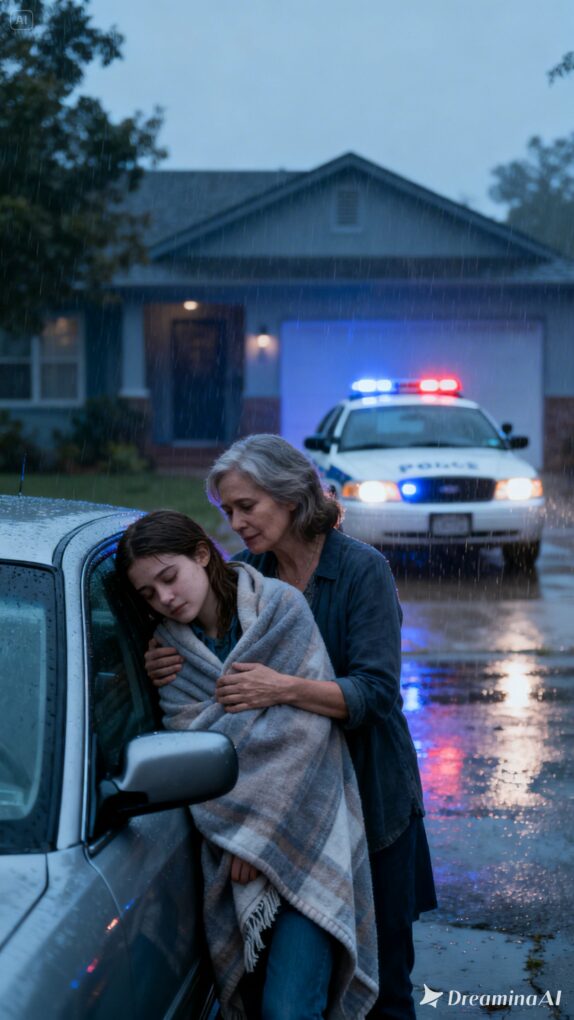She tried. Her mascara had run down her cheeks, mixing with rainwater. “Mom… I’m fine,” she whispered, which told me she absolutely wasn’t.