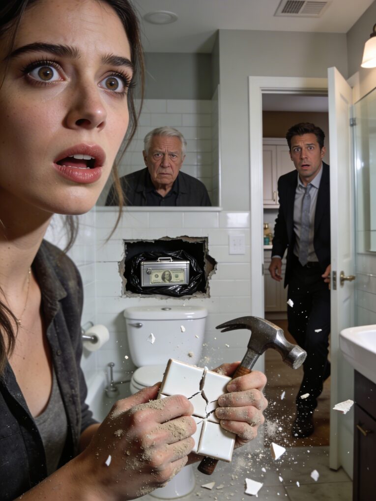While my husband was out, my father-in-law whispered, “Take a hammer. Break the tile behind the toilet—now.” My hands shook as the ceramic cracked, dust filling the air. Behind it, a dark hole appeared. I froze. “Oh my God… what is that?” I gasped. He didn’t answer. He just looked at me and said, “You weren’t supposed to find this.”