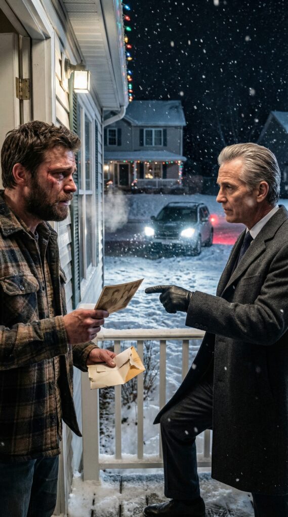 A man stood on my porch in a flawless charcoal suit, snow collecting on his shoulders like he didn’t feel the cold. He looked mid-fifties, silver at the temples, calm eyes that measured everything.