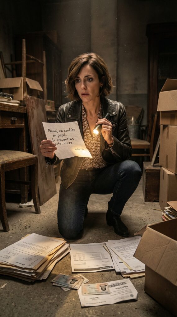 Bajé otra vez al sótano, obsesionada con encontrar una explicación. Abrí la última caja, la que estaba al fondo, sellada con cinta nueva. Dentro había un móvil viejo envuelto en una camiseta y, encima, una nota doblada. La abrí y leí una sola frase, escrita con letra de Mateo: “Mamá, no confíes en papá. Si encuentras esto, corre.”