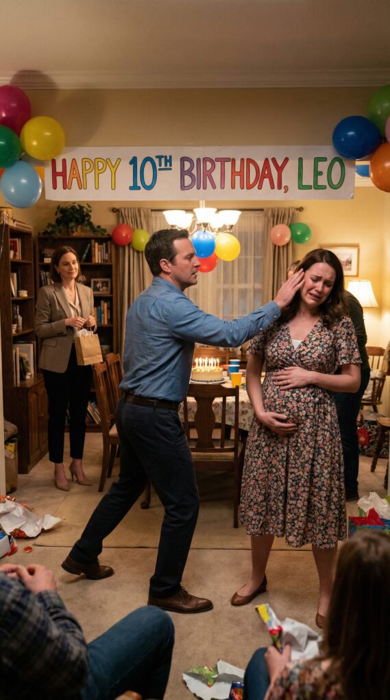A sharp crack split the room—his palm across my face so hard my vision flashed white. I stumbled into the table, plates rattling, frosting smeared. The baby kicked, and I gasped, terrified.
