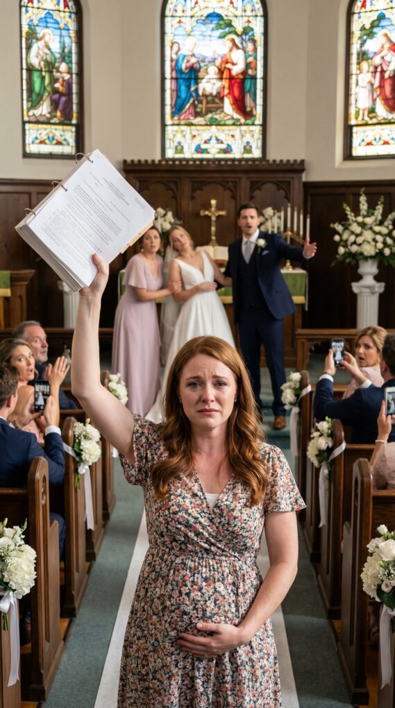 I walked down the aisle slowly, one hand on my belly, the other holding a thick stack of documents clipped together. Madeline stood at the altar in satin and pearls, eyes wide, mascara already trembling at the edges.