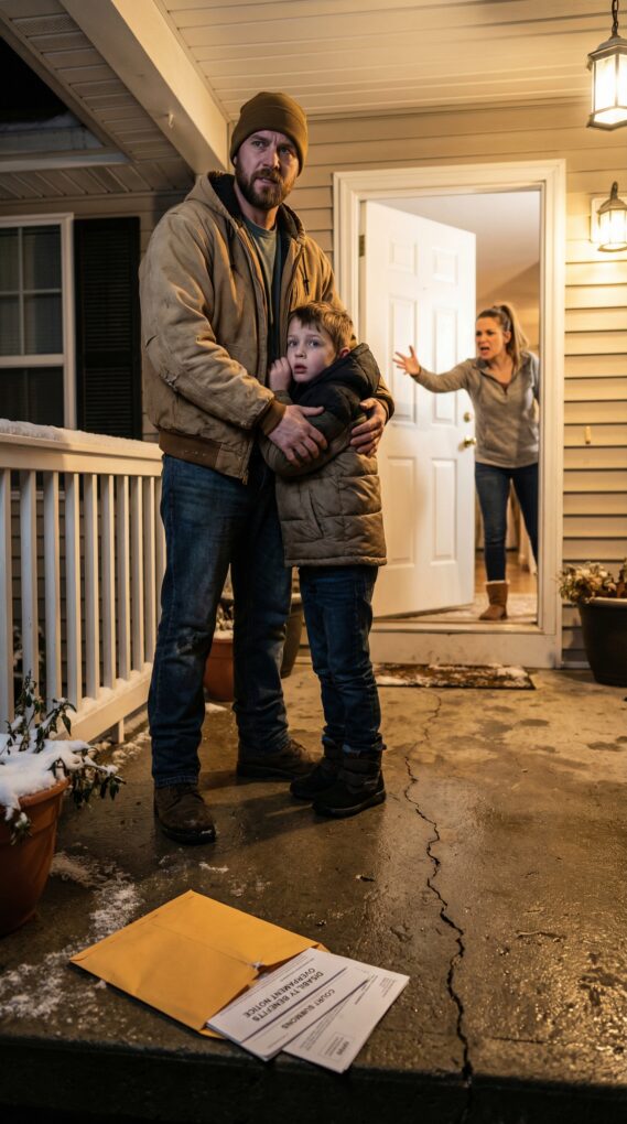 I carried Eli to my car, heart pounding. That’s when something smacked the concrete behind us. Not a toy. A thick manila envelope, corners bent, papers spilling under the porch light.