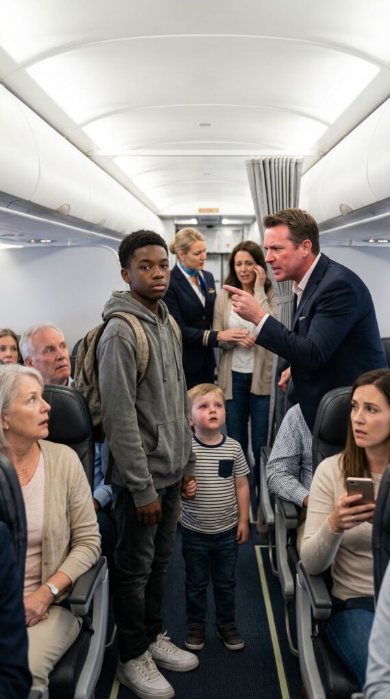Gavin’s stare was sharp, annoyed at first—like someone had interrupted his world. Then he registered the silence, the way his son was sitting upright, staring at the teen as if he’d just been pulled back from the edge of something. Gavin unbuckled and strode down the aisle with the confidence of a man used to problems folding for him.