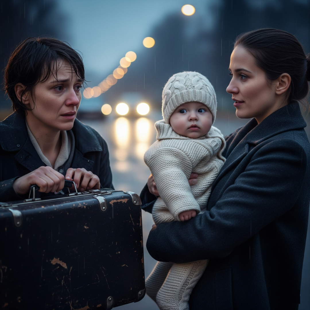 I was left standing in the downpour — a stranger on a cracked sidewalk, clutching someone else’s child and a suitcase full of secrets.