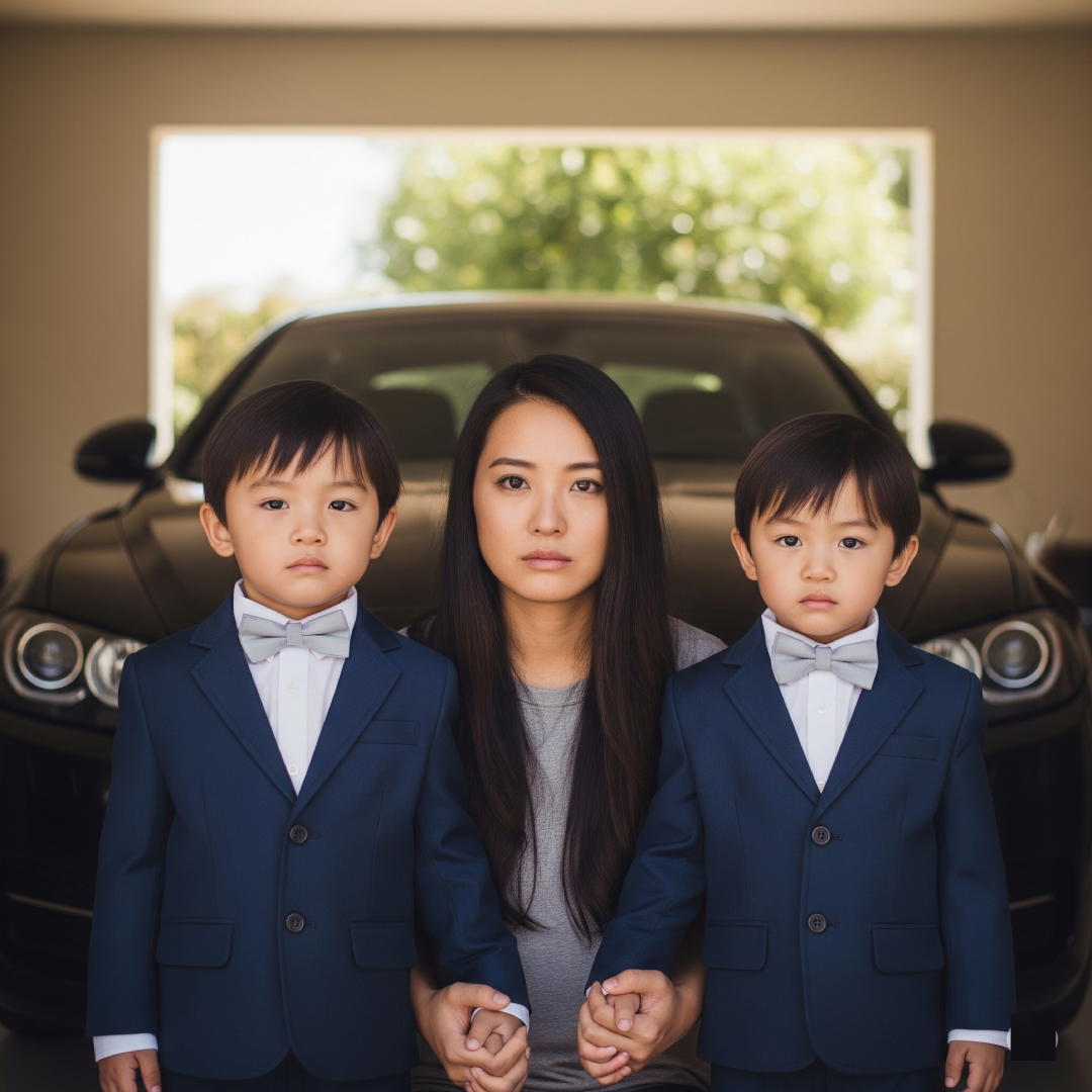 In the back seat, two little boys sat in matching navy suits, staring out the window with curiosity and quiet strength—just like her. Their soft hands held hers tightly.