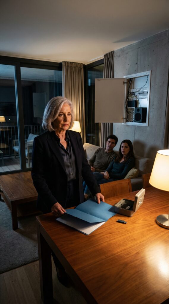 Esa tarde los cité en casa. Fingí serenidad. Puse café, el mismo que siempre, como si el ritual pudiera salvarme. Cuando llegaron, Álvaro habló primero: “Mamá, lo del banco… te llamarán, es normal.” Lucía me tomó la mano: “Es por tu bien.” Yo retiré la mano con suavidad y dije, despacio: “Quiero que me expliquéis por qué existe un contrato de cesión total de mis bienes con tu nombre, Álvaro.” Él parpadeó, demasiado rápido. “¿Quién te lo dijo?” Yo abrí la carpeta azul sobre la mesa. Y antes de que nadie respondiera, sonó un clic en la pared del salón: un altavoz empotrado que nunca había visto se activó y la voz grabada de Javier llenó la casa: “María, si escuchas esto delante de ellos, no te dejes quebrar.”