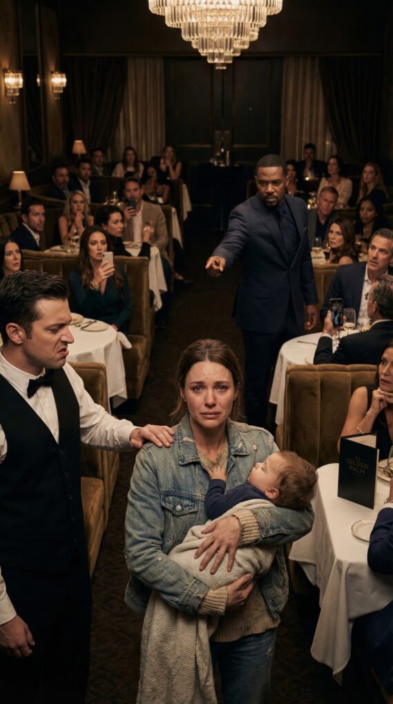 The hostess blinked like she’d heard a bad joke. Before she could answer, a waiter in a crisp black vest strode over, face tightening. His name tag read Derek. He looked Emily up and down—her faded hoodie, the worn sneakers, the diaper bag strap cutting into her shoulder—and his lips curled.