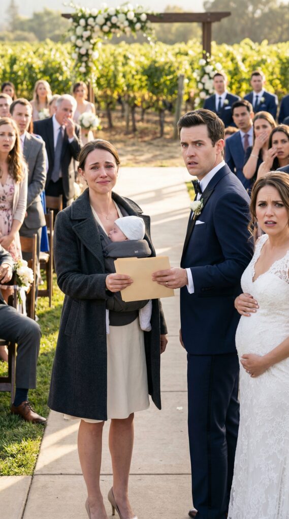 At the vineyard, everything looked like a magazine spread: white chairs lined in neat rows, pale roses, guests in tailored suits and dresses that whispered money. I walked in quietly, blending in until I didn’t.