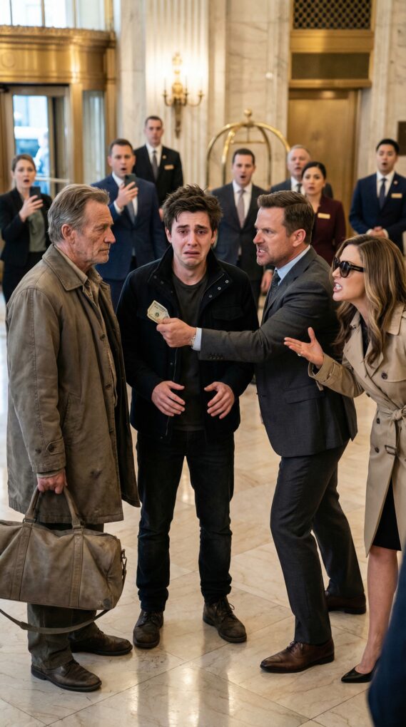 Dad turned on him. “We told you not to come into the lobby dressed like that.” He reached into his pocket, pulled out a crumpled bill, and shoved it toward Grandpa’s chest. “Here. One hundred bucks. Go sit somewhere. Get food. Do something. Just—” His jaw tightened. “—get out.”