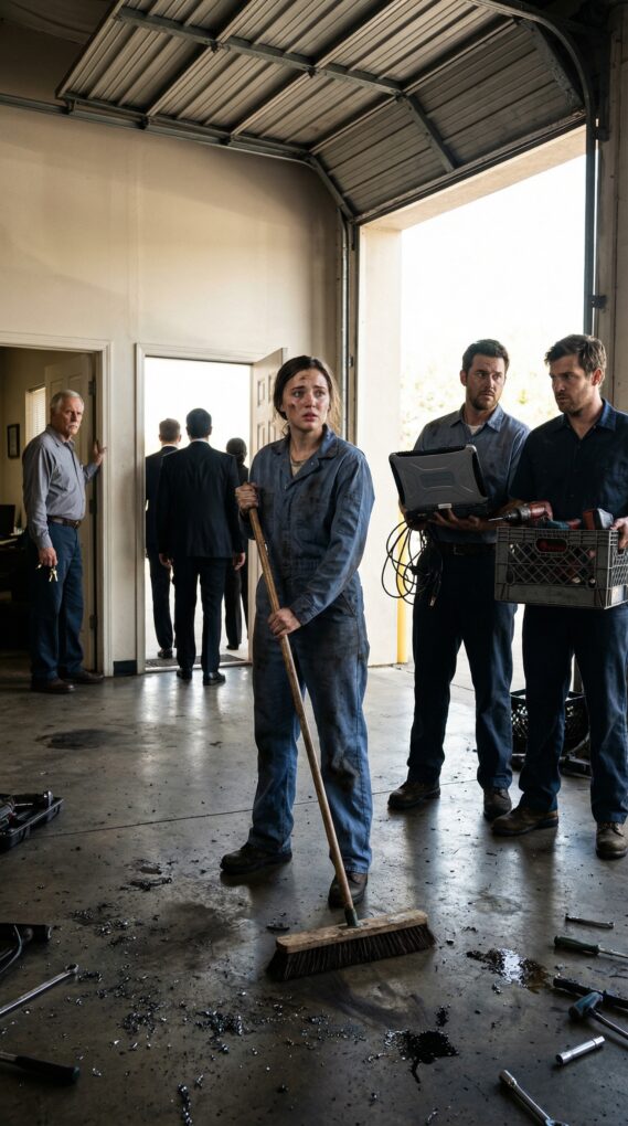 I started sweeping, pushing grit into a neat line. My throat tightened. “I’m making sure your shop doesn’t close looking like a junkyard,” I said. “You gave me dignity when I didn’t have much of it. If this is the last day, it should end with respect.”