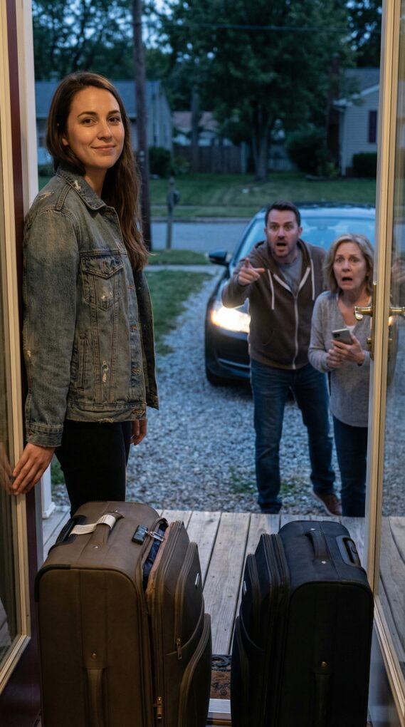 Ryan jumped out before the engine even died, shoulders tense, jaw set like he’d rehearsed this moment. Donna was outside too, phone pressed to her ear, eyes flicking between me and the suitcases like they were explosives.