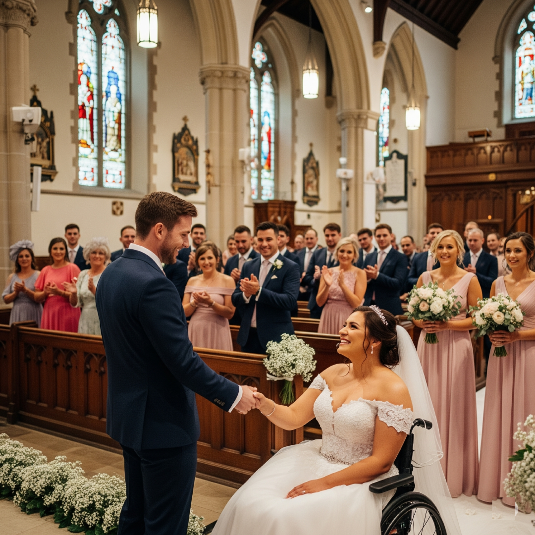 The church was silent as the wedding music began to play. Guests turned their heads, expecting to see the bride walking toward the altar. Instead, they saw her—graceful in her white gown—sitting in a wheelchair, holding a bouquet tightly in trembling hands.