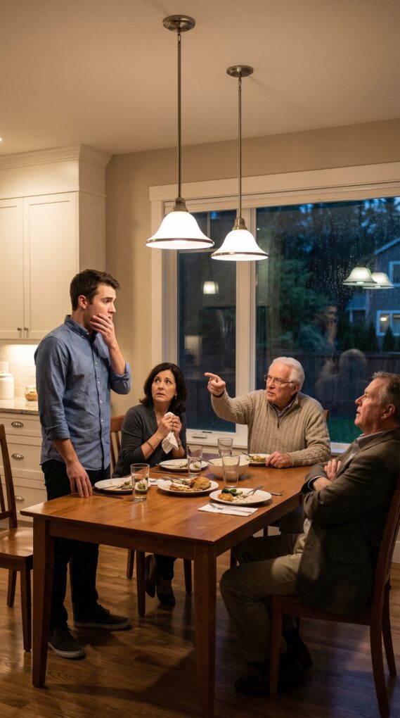 Because my grandfather slowly set down his glass… and looked directly at me.