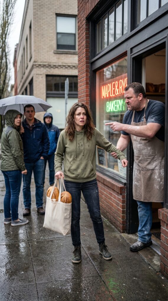 The baker stood behind me—broad shoulders, flour dusting his arms, anger blazing in his eyes. He yanked open my tote bag and pulled out the bread like it was stolen gold.