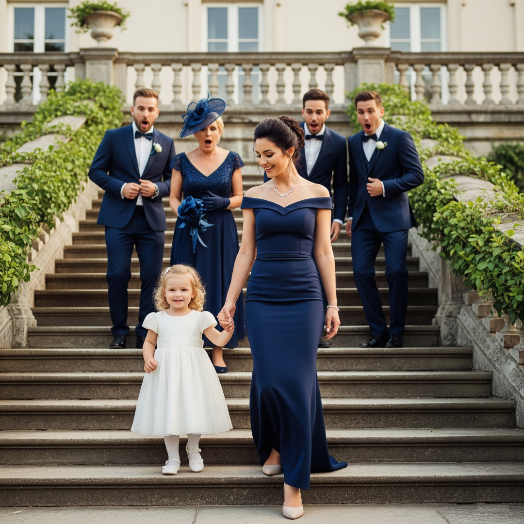 In a gown that matched the wedding party’s navy theme, she looked stunning, radiant even. But it was the little girl beside her—maybe three or four years old—that stole the breath from everyone around.