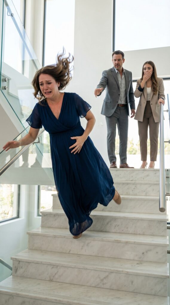 She never finished. Daniel moved fast, crossing the room before she could step back. His fingers clamped onto her shoulders hard enough to send a bolt of pain down her arms. She gasped and tried to twist away, but her heel slipped against the polished floor. The room lurched. Shelves blurred. Her body went backward into empty air. She heard her own scream, then the brutal thud of impact as her side and head slammed against the edge of a low table before she hit the floor.