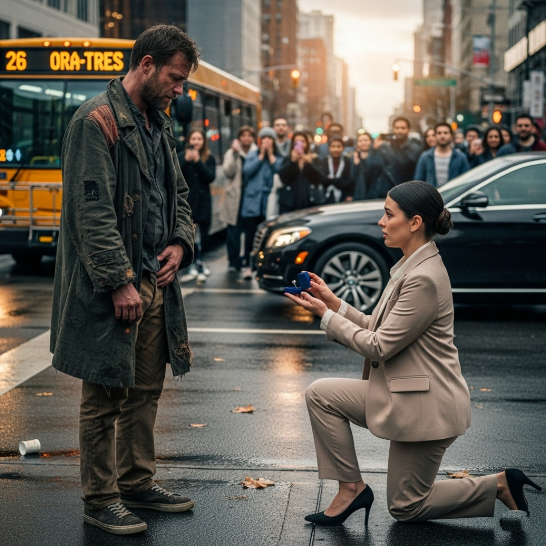 The sky drizzled a soft curtain of rain as people bustled past, umbrellas up, eyes down — but no one noticed the woman in a beige suit drop to her knees in the middle of the intersection. Her voice trembled. “Please… marry me,” she whispered, holding out a velvet box.