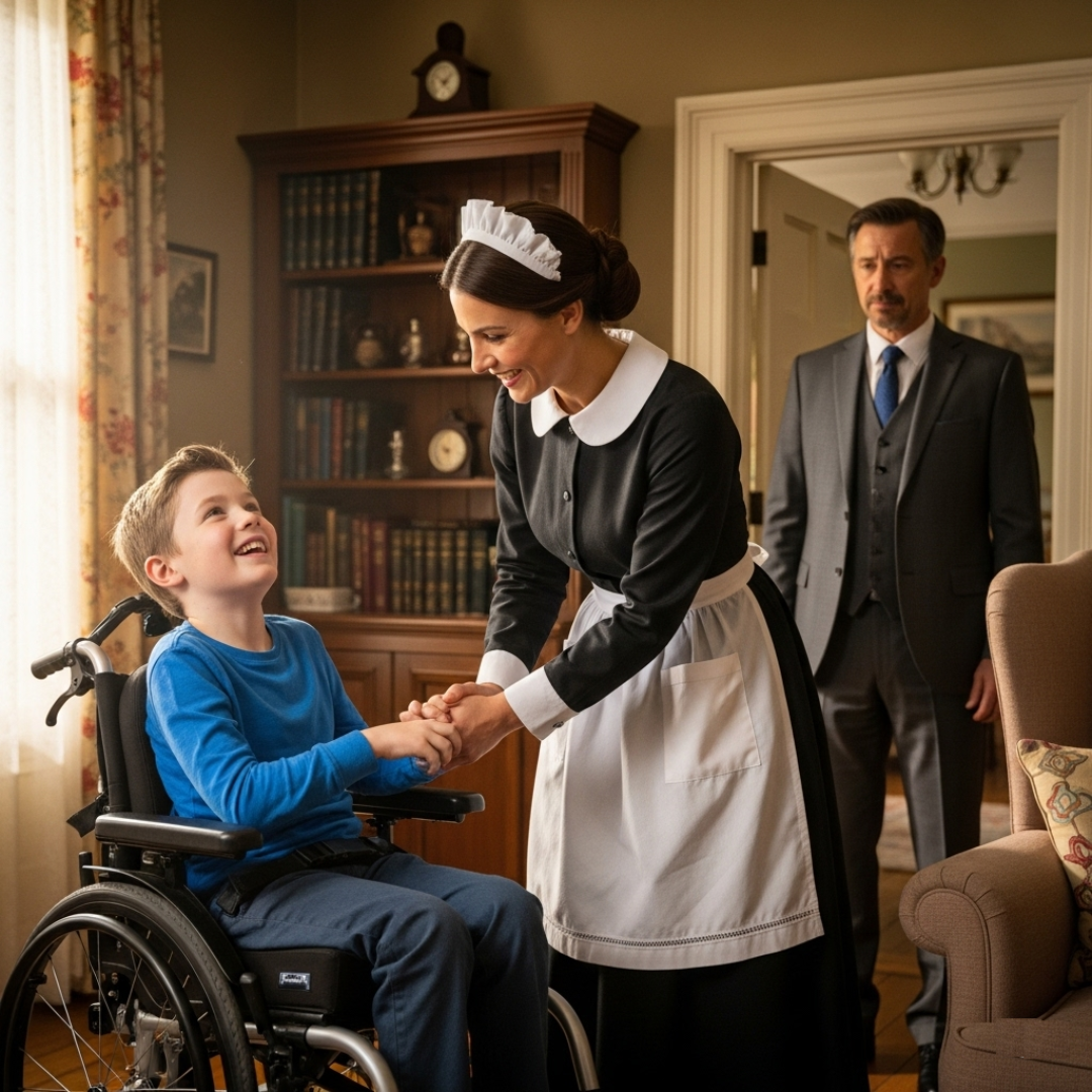 There, in the middle of the study, was his son, Ethan—confined to a wheelchair since the accident—laughing so hard his cheeks were red. Holding his hands was the maid, Clara, her black uniform swaying as she moved to the rhythm. She was guiding him in a sort of seated dance, spinning his chair gently in circles, her eyes locked on his as if the rest of the world didn’t exist.