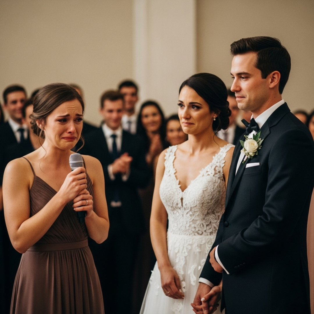 Emily Carter stood frozen, clutching the microphone as the weight of a hundred eyes fell on her. The soft hum of chatter in the grand wedding hall faded into an uneasy silence. In front of her stood Daniel Blake—her ex-husband—dressed in a tailored tuxedo, holding hands with his radiant new bride, Olivia. Their smiles faltered as Emily’s trembling voice filled the air.