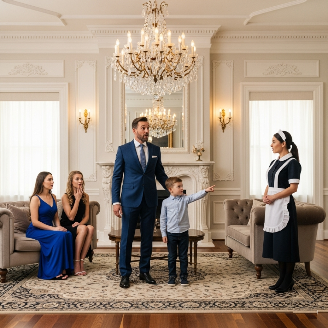 Daniel’s gaze swept over the three women. They were beautiful, glamorous, and polished, but something about their rehearsed smiles made him shrink back. His little hand trembled, and he glanced toward the far side of the room—where Isabella, the young maid, stood quietly in her uniform. She wasn’t supposed to be part of this scene at all. She was just the help, hired to keep the household in order.