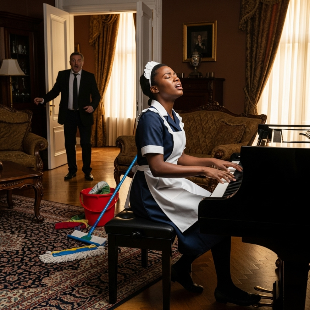There, seated at the piano, was his maid. Dressed in her uniform, apron still tied, mop and bucket abandoned nearby, she played with her eyes closed, her fingers moving gracefully over the keys. The notes filled the room with aching tenderness, a melody so rich it felt alive.