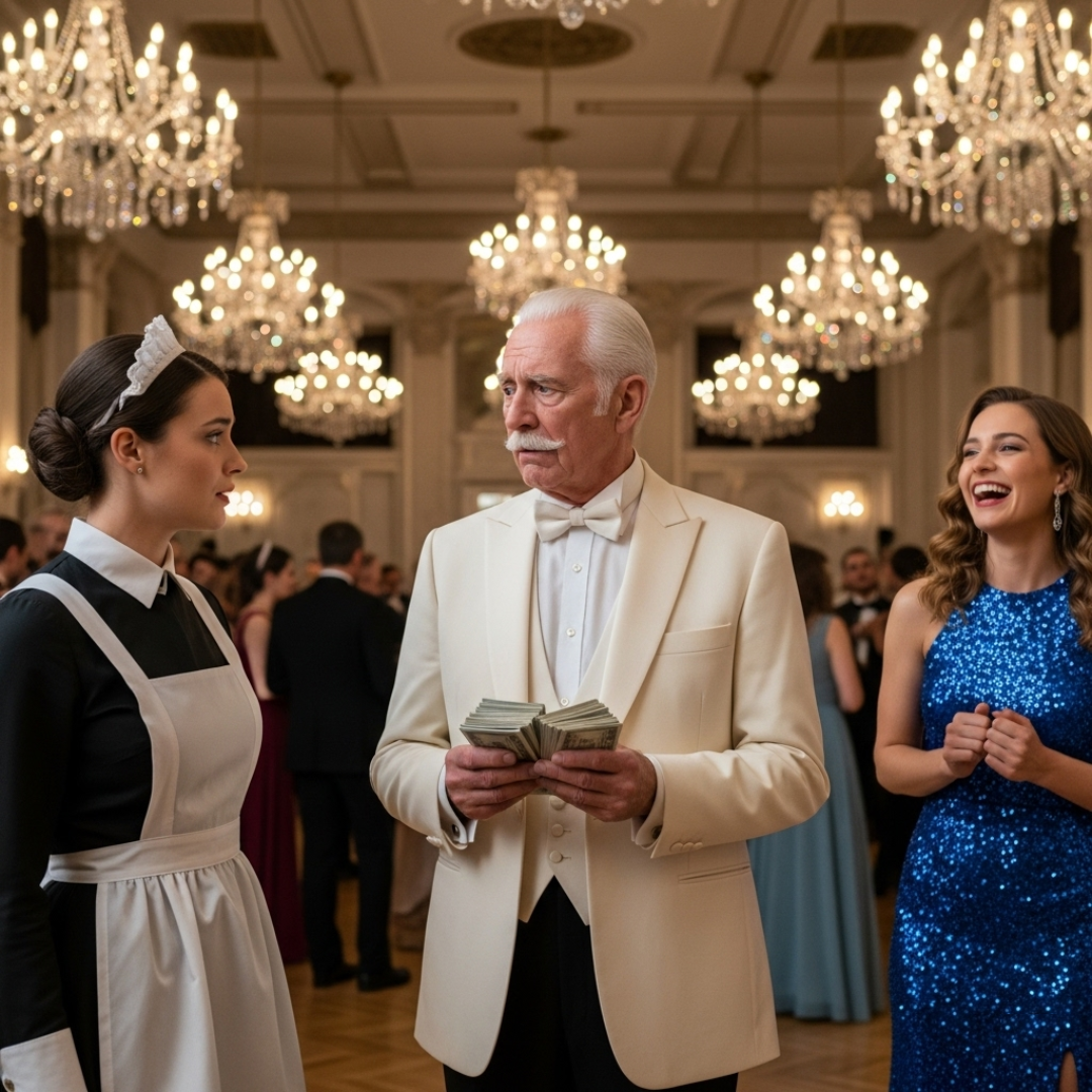 The chandeliers glittered like diamonds that night at the Waldorf Grand Ballroom in Vienna. Wealthy guests floated across the polished marble floor, their laughter mingling with the delicate music of the live orchestra. Among them stood Victor Langley, a silver-haired millionaire with a reputation for being both ruthless in business and mercilessly arrogant in public. Tonight, he was dressed in a pristine white tuxedo, his pocket bulging with cash, a sign of both wealth and pride.