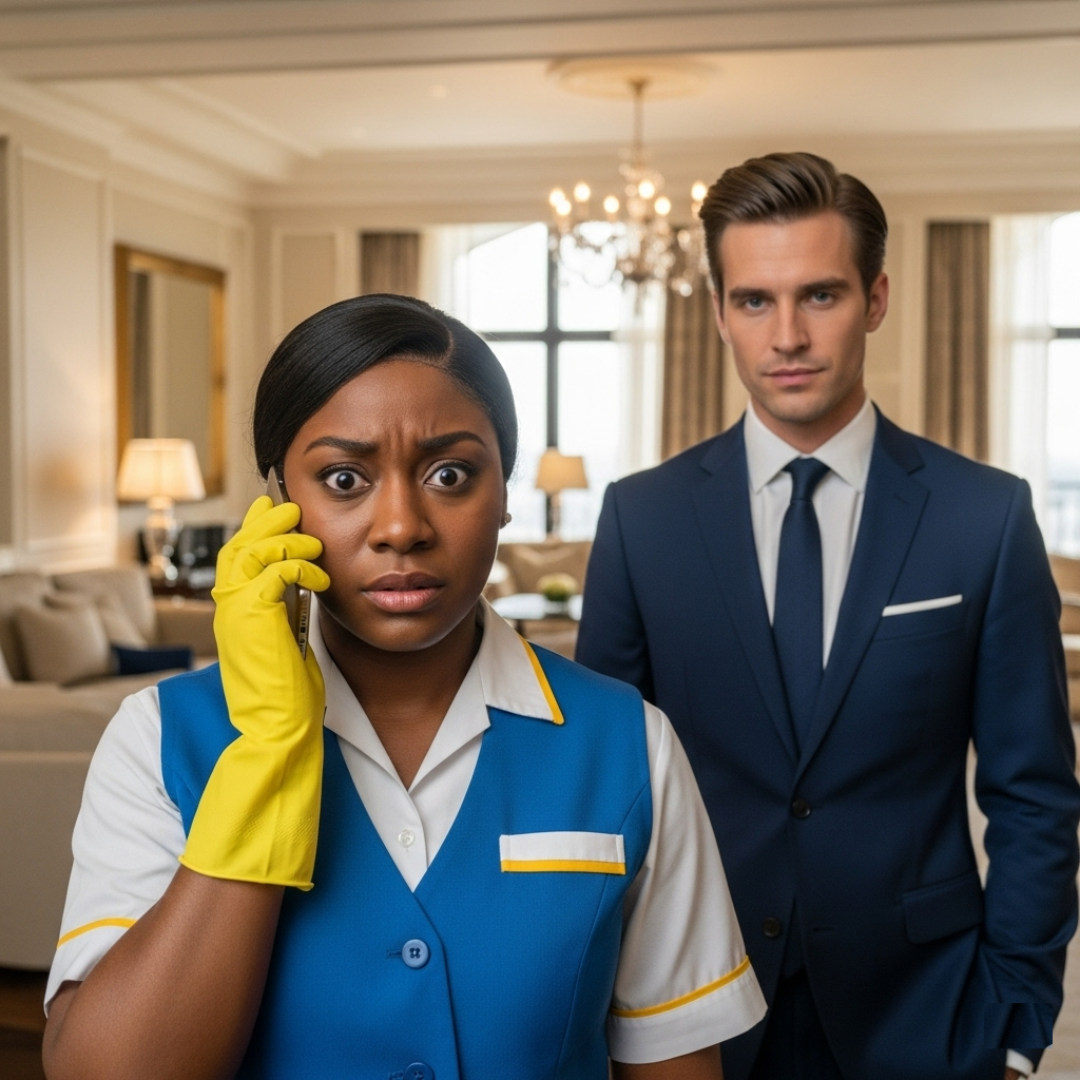 The luxury suite smelled faintly of leather and expensive cologne. Naomi Johnson, dressed in her crisp blue-and-white maid’s uniform with yellow cleaning gloves still on, moved silently between the polished tables and velvet curtains. For her, this wasn’t a palace—it was just another room to dust, another mirror to polish.