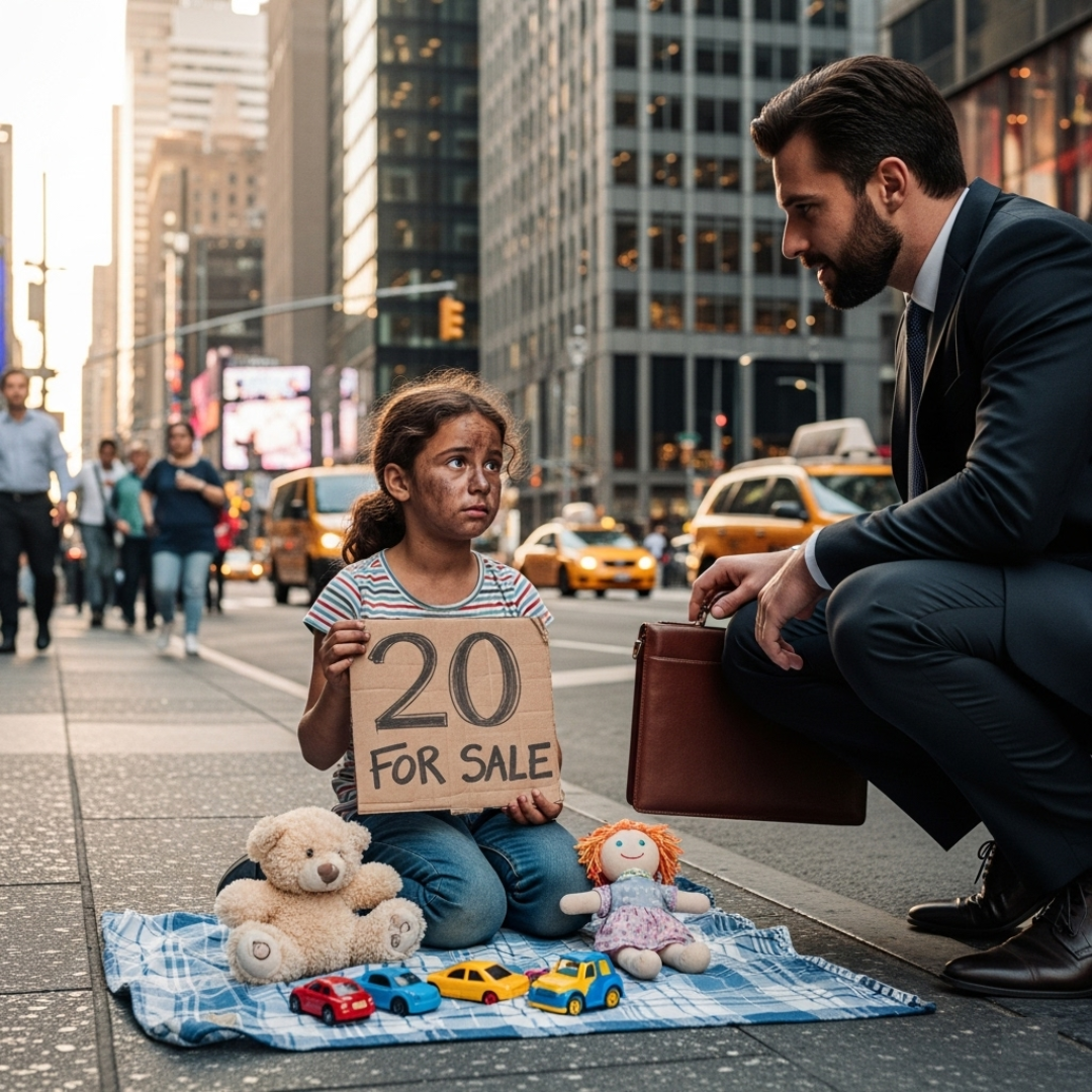 Right on the corner of 42nd Street, a little girl sat on a thin blanket. Her face was smudged with dirt, her striped shirt worn out, but her wide brown eyes told a story that words could never fully express. In front of her were a few toys: a small teddy bear, two toy cars, and a rag doll with fading yarn hair. She held up a piece of cardboard with shaky handwriting: “$20 FOR SALE.”