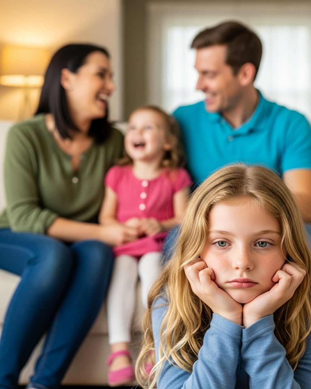 One Saturday afternoon, the family gathered in the living room. Laughter filled the air as Mark lifted Lily into the air like a princess. Julia clapped along, her eyes glowing with joy. Sophie sat nearby, chin resting on her hands, feeling the familiar sting of being left out.