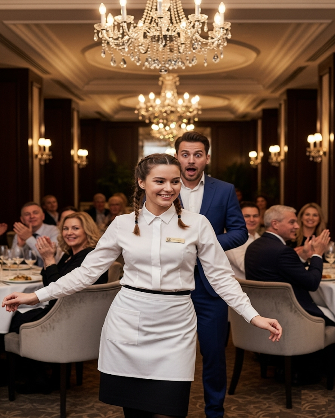 But then his gaze landed on Anna, a young waitress weaving gracefully among the tables, balancing trays with uncanny poise. There was something in the way she moved—light, steady, almost rhythmic—that caught his attention. He smirked, leaning toward his circle of wealthy friends. “Watch this,” he said. “I’ll make the waitress dance. Let’s see if she can shine in front of the chandeliers, not just polish the glasses beneath them.”