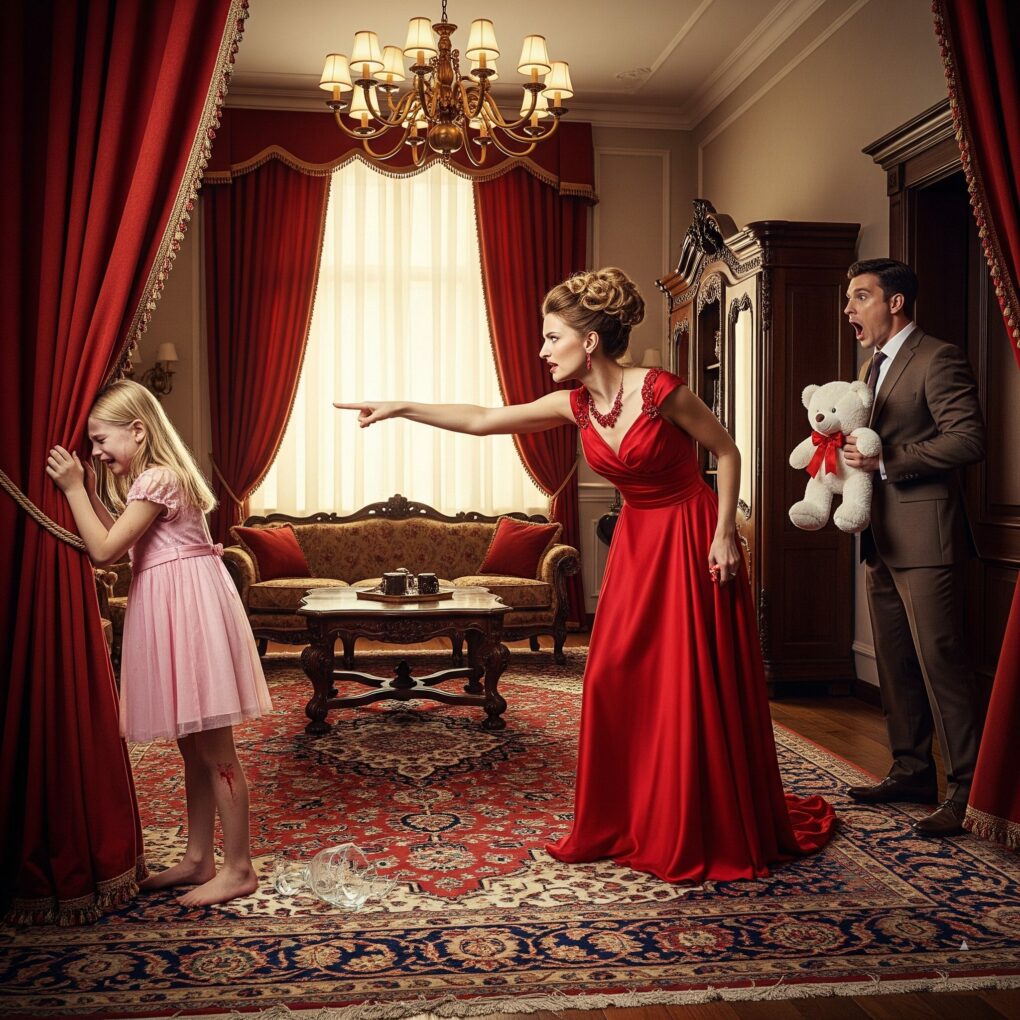 Instead, Victoria—her stepmother, draped in a scarlet evening gown—stood over her with a finger pointed like a blade. “You clumsy, ungrateful child! Do you have any idea what you’ve ruined?” she spat, her voice dripping with disdain. The grandeur of the chandelier above, the polished furniture, and the richness of the room only amplified the cruelty in her tone. This house had everything money could buy—except love for Lily.