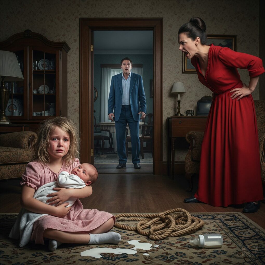 “Don’t hurt us,” the little girl sobbed, clutching her baby sibling tightly in her arms. Her voice trembled, and her tear-stained face turned toward the woman towering over her. The living room smelled faintly of spilled milk, a bottle rolling across the carpet near a coiled rope that had fallen to the floor. The woman in the red dress—her stepmother, Veronica—stood with hands on her hips, screaming down at her.