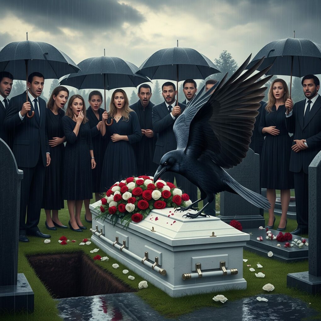 A black crow descended, perching right on top of Kiana’s coffin. Gasps rippled through the mourners. The bird pecked sharply, and with a startling crack, a small hidden camera fell from beneath the flower arrangement.