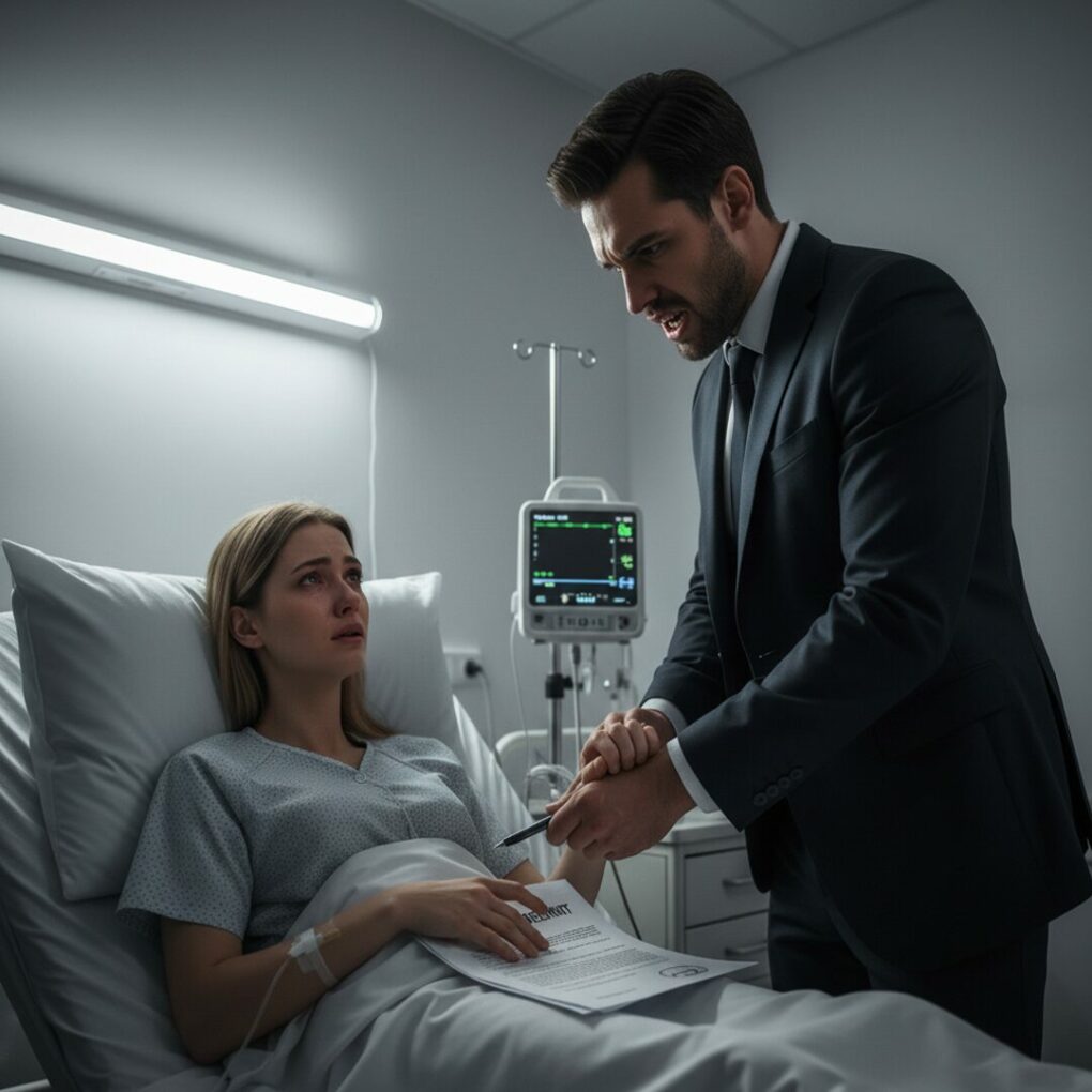 The antiseptic smell clung to the air as Emily Carter lay propped up against thin hospital pillows, her body weak after a complicated miscarriage. Tubes and monitors beeped softly, a cruel reminder of all she had just lost. She turned her head when the door opened, expecting a nurse. Instead, her husband, Daniel, strode in with a stiff jaw and a manila folder in hand.