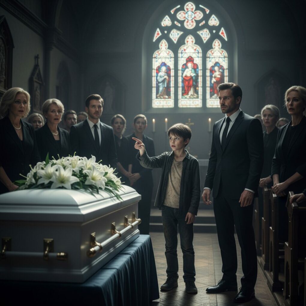 Standing near the doorway was a ragged boy, no older than ten, his hair tangled, his clothes torn and stained. His face was pale but his eyes burned with certainty. Slowly, his arm lifted, finger pointing toward a man seated in the crowd—a man in a dark suit who shifted uncomfortably as every gaze fell on him.
