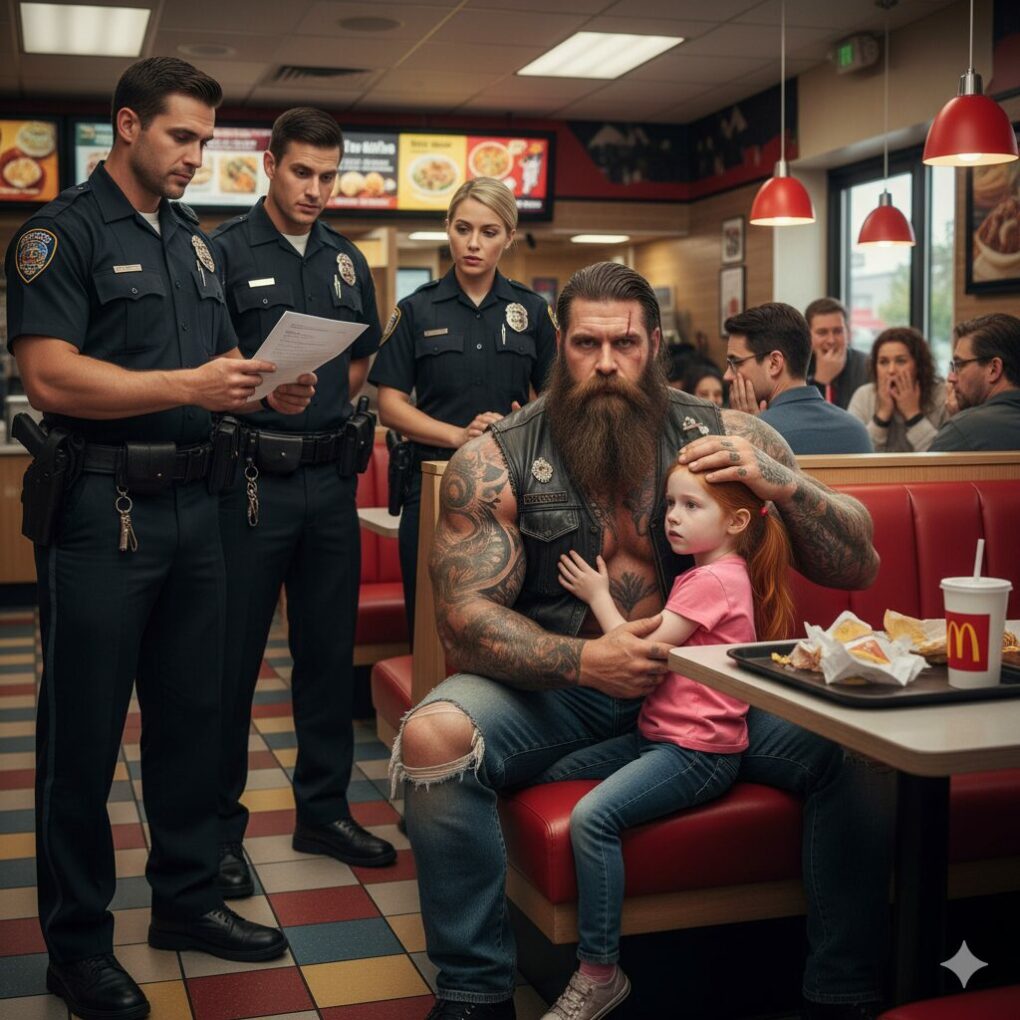 Still, people muttered. Mothers frowned, fathers shook their heads. I myself wondered—what was a little girl doing with a man like him? One Saturday, the tension broke. Three police officers walked in, called by the manager. The restaurant went silent as they approached the biker and the child.