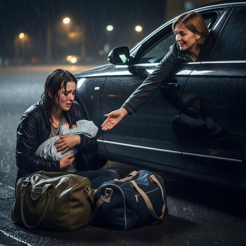 The rain was coming down in sheets, soaking through my thin jacket as I sat on the curb with my newborn son in my arms. Two duffel bags sat at my feet, stuffed with bottles, diapers, and a few clothes. That was everything I had left of my marriage.