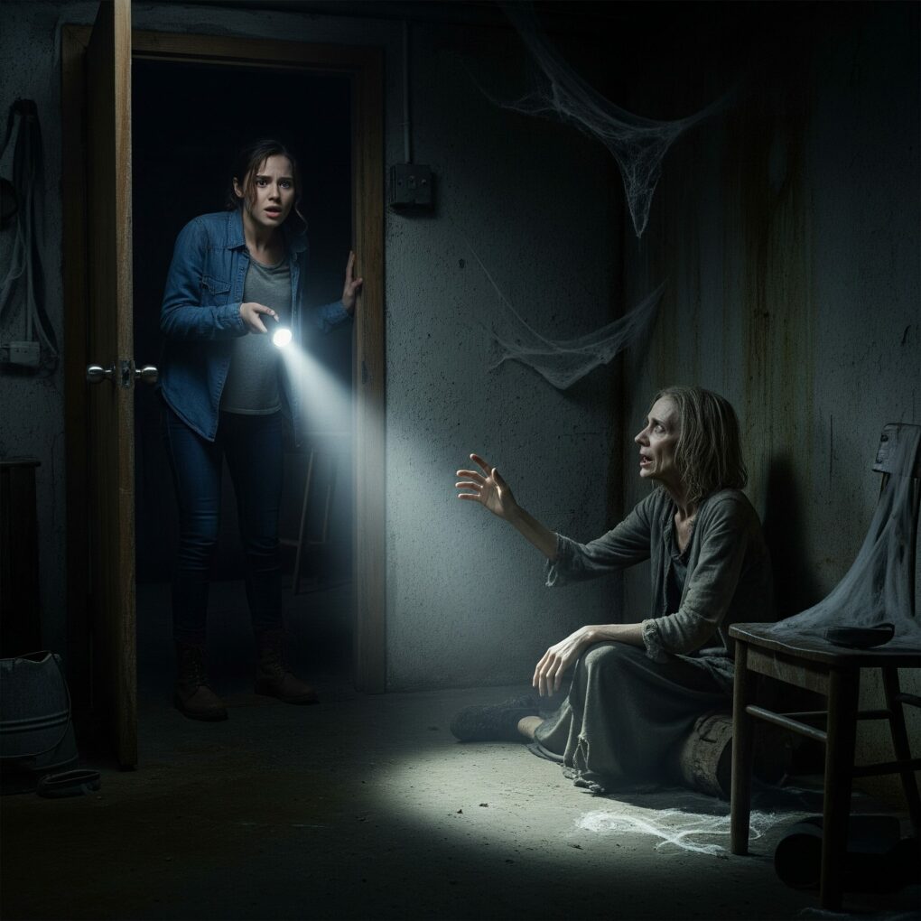 The smell hit her first—dampness, mildew, something sour. She descended slowly, the light dim. And then she froze.
