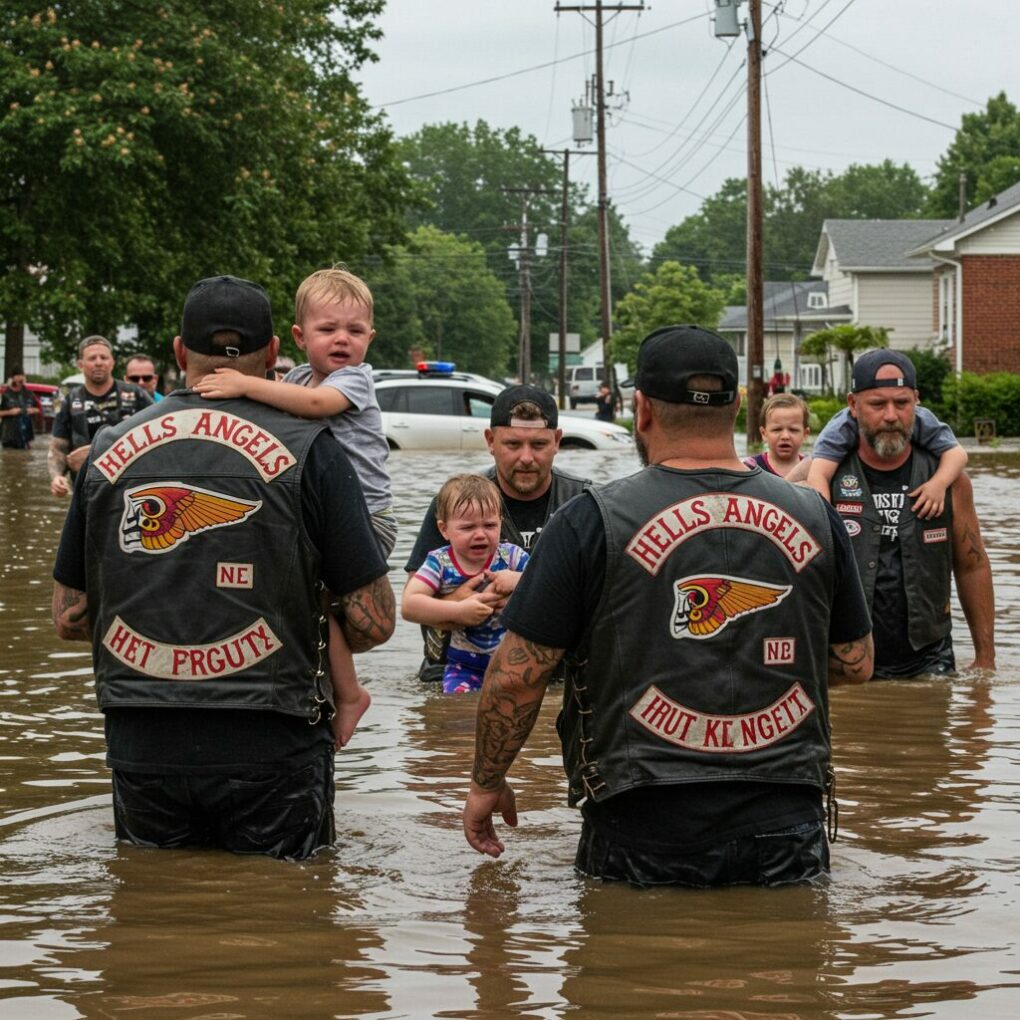 One by one, the bikers waded, swam, and carried children on their backs or cradled in their arms. Their boots dragged against the current, their tattoos smeared with mud, but they never let go. The teacher, still paralyzed by fear, could only watch as strangers did what she could not—risking everything to save her students.
