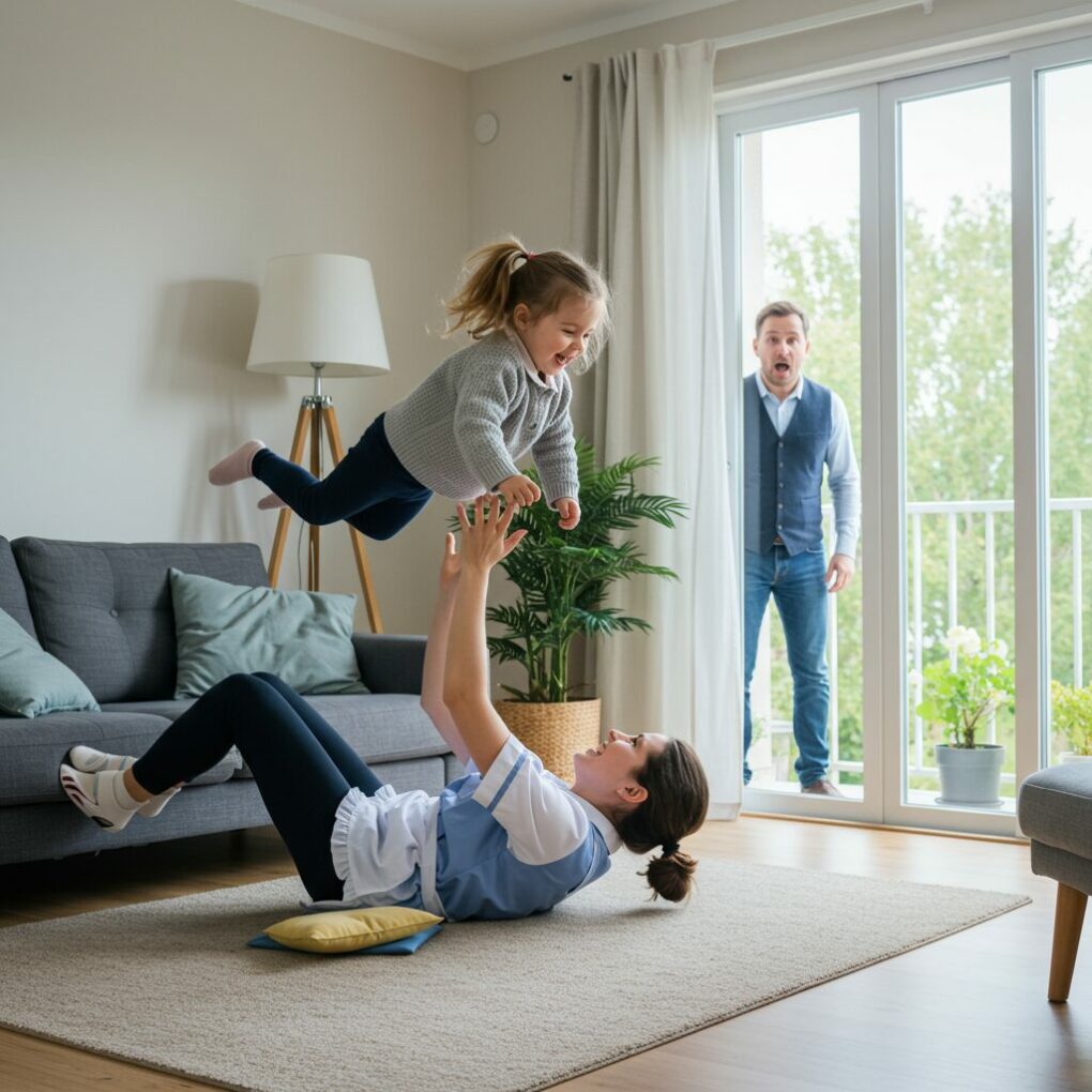 Weeks passed, and Maya’s unconventional approach continued. Instead of demanding exercises, she wove physical activity into play. She lay on the carpet with Elara, balancing stuffed animals on their stomachs to make her engage her core. She invented games that encouraged Elara to stretch her arms, shift her weight, and test her balance—though Elara never realized these were exercises. To her, it was just fun.