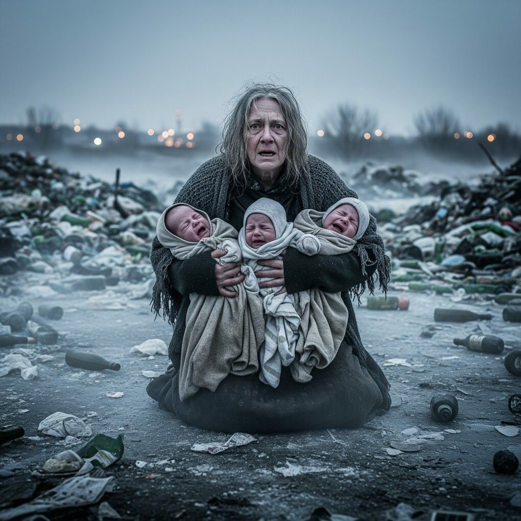 On a freezing winter night, cries echoed through the empty streets near an industrial dump. A frail woman named Hope, who survived on scraps and slept under broken roofs, followed the sound. She found them—three newborn babies, wrapped in dirty cloth, shivering on top of a pile of trash.